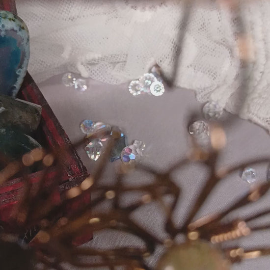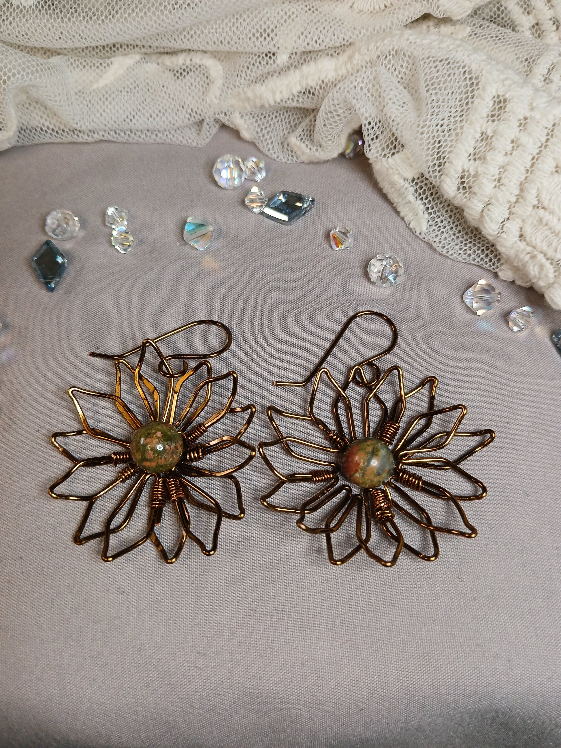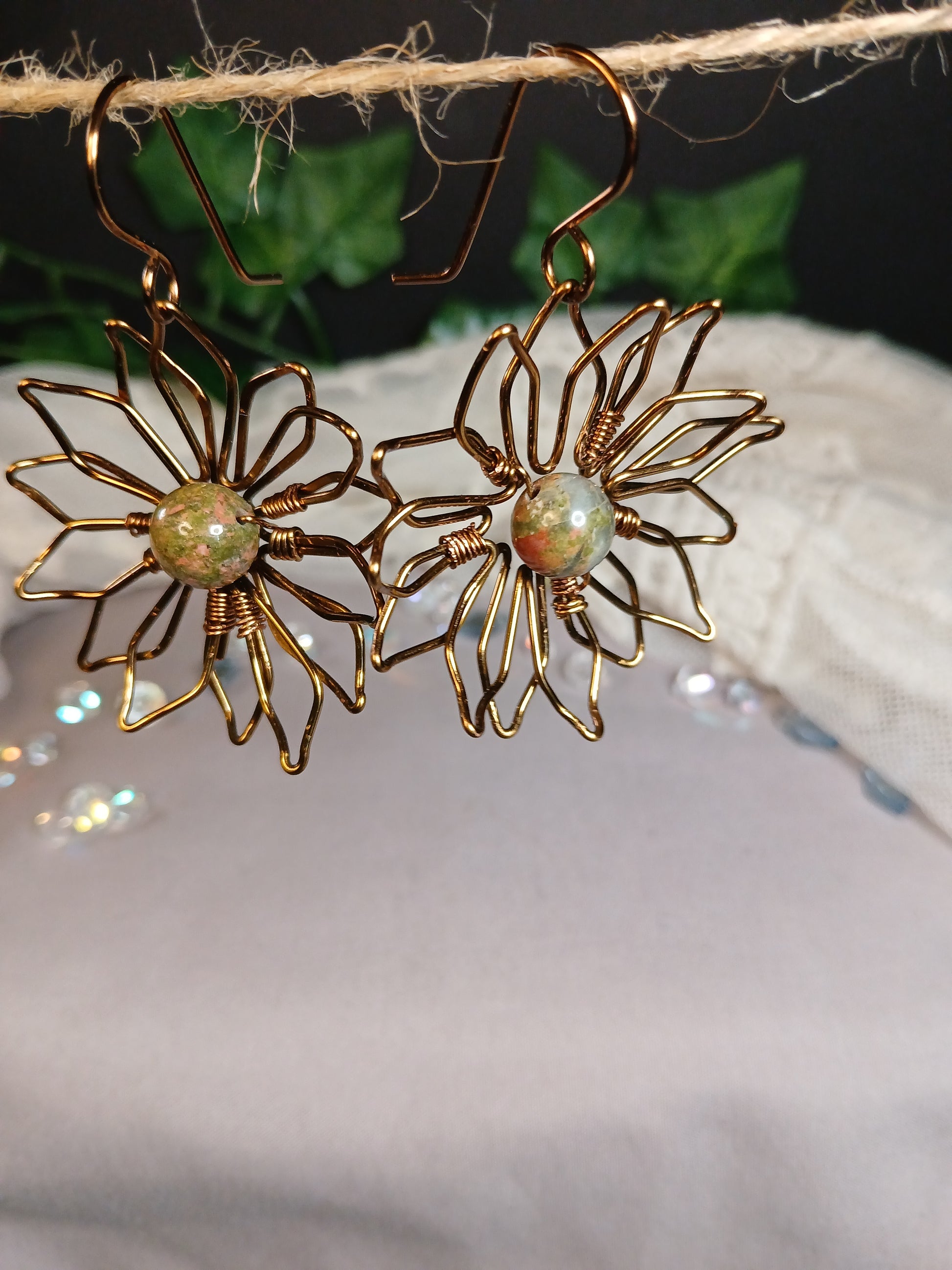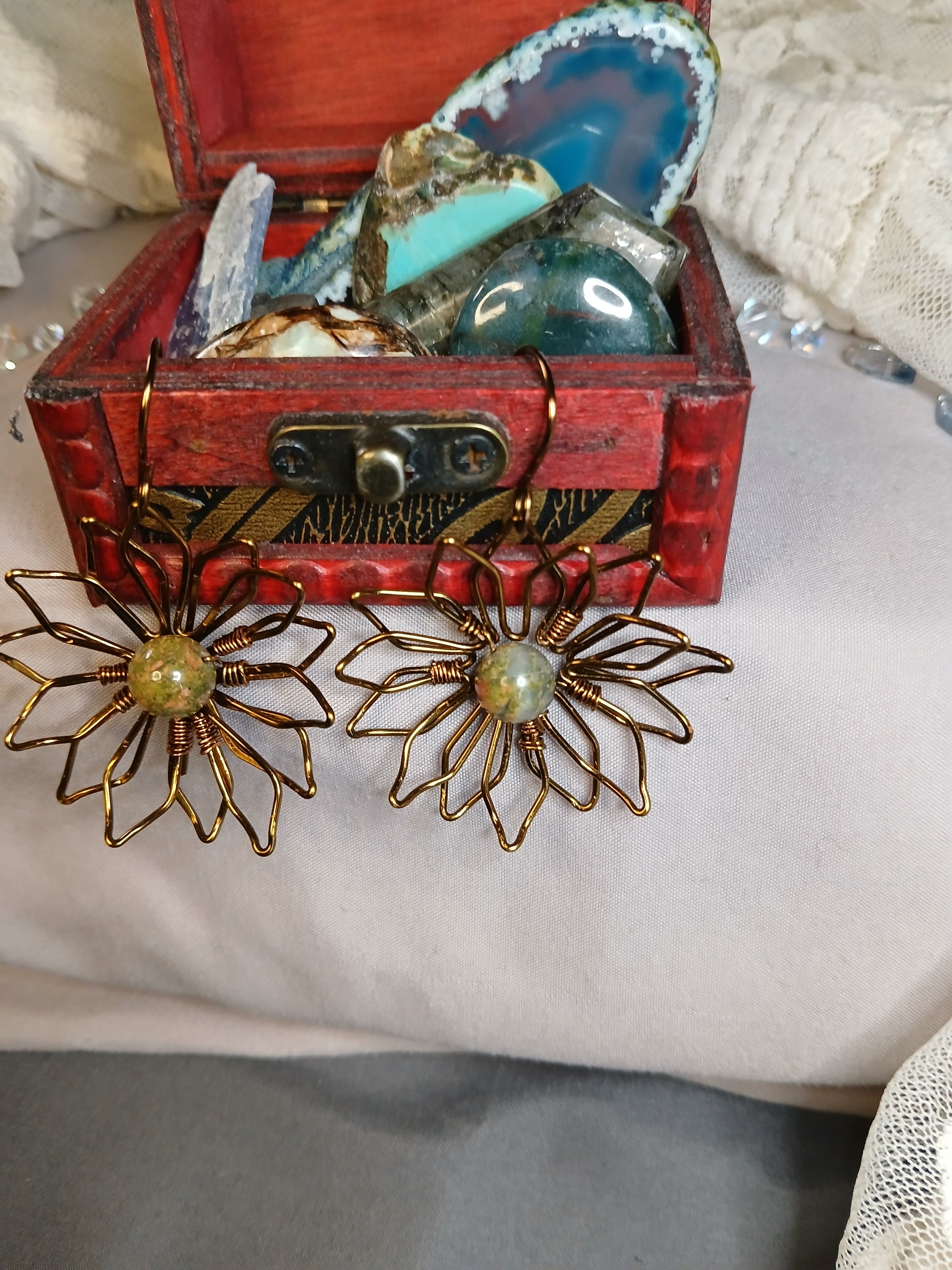 At the heart of these handcrafted blooms rests a striking Ukanite bead which promotes vision and transformation. Its earthy tones and unique matrix perfectly complementing the rich, antique bronze finish. This thoughtful pairing creates a harmonious blend of nature-inspired beauty and artisanal elegance.