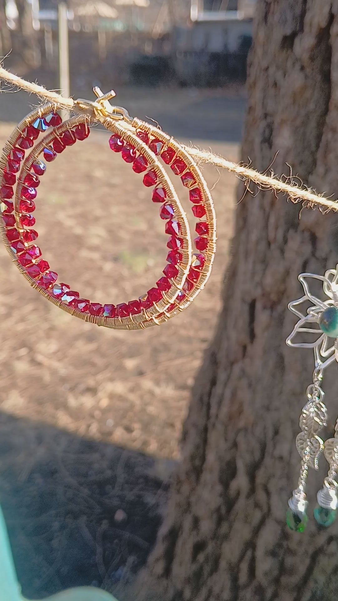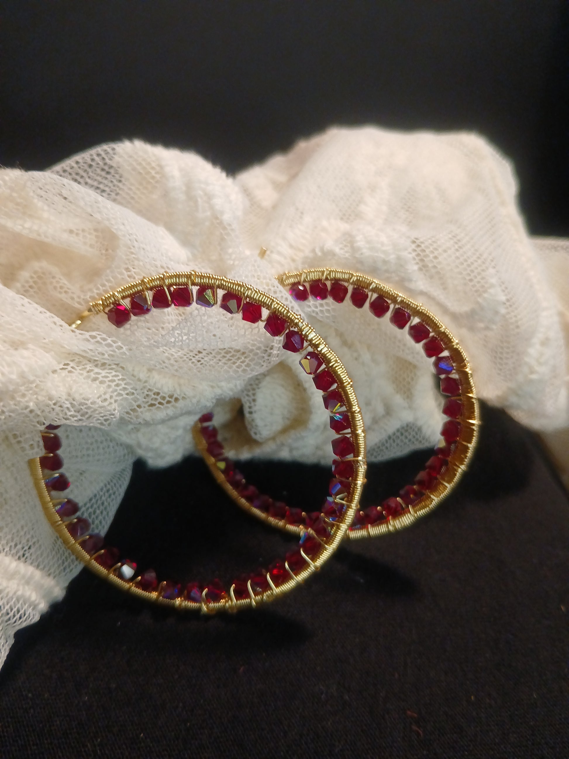 Elegant gold-plated copper wire hoops featuring vibrant crimson chech glass beads that are layered and woven together in a intricate wrapping process. A perfect touch of color and sophistication for everyday wear or special occasions. Moderately sized.
