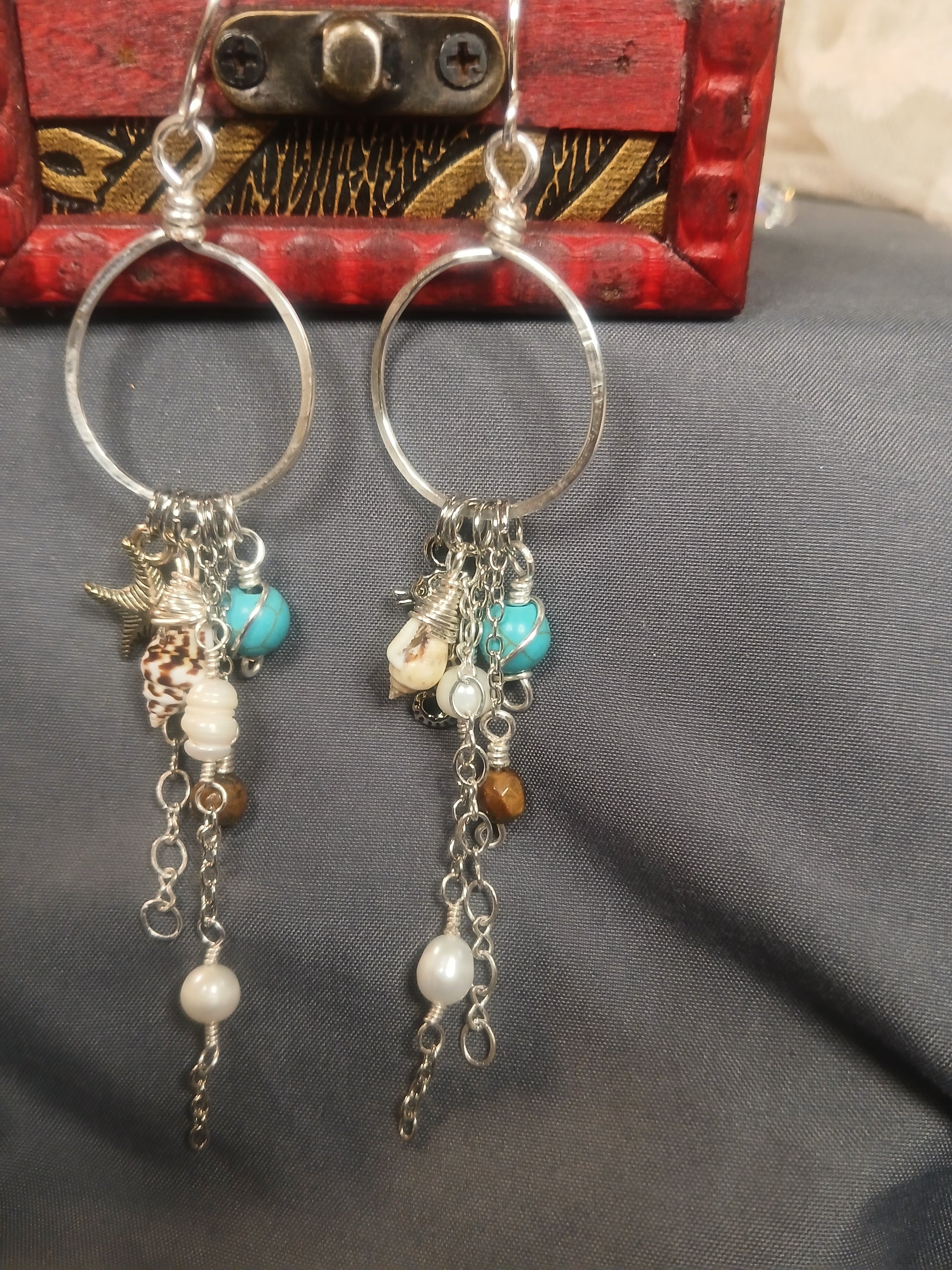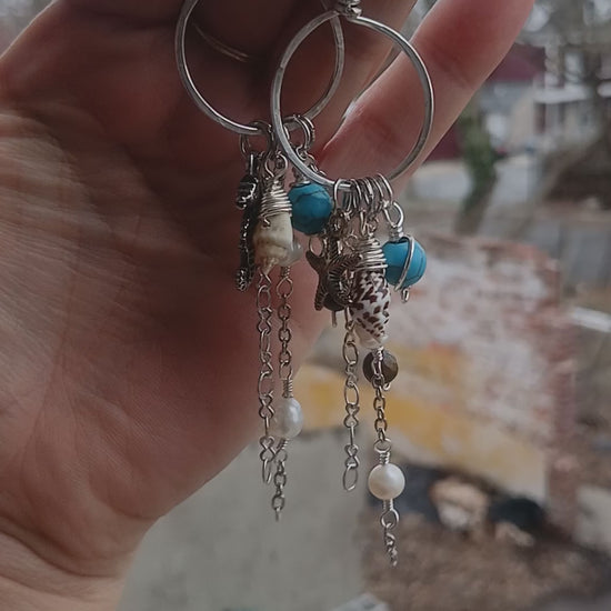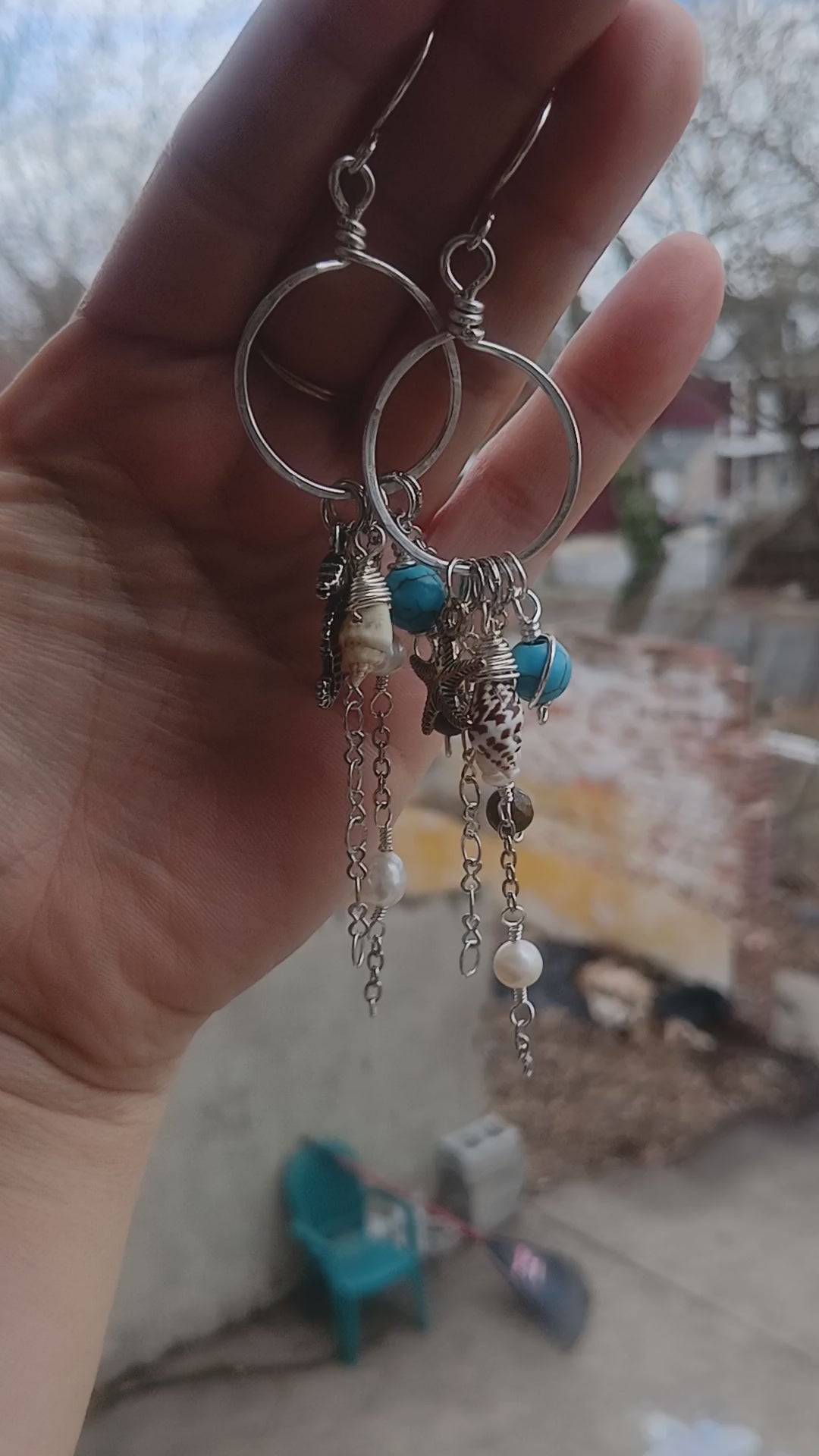 Dive into style with our Seaside Serenade cluster dangle earrings. These charming earrings feature a silver plated copper wire hoop suspended with a delightful array of beach inspired elements. A vibrant shell bead, freshwater pearls, calming blue dyed howlight, grounding tigers Eye and adorable starfish and seahorse charms. This cluster of elements creates a unique gathering of beachy charm that will bring the calm of the ocean to any outfit.