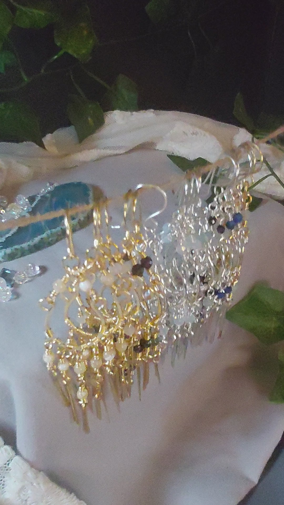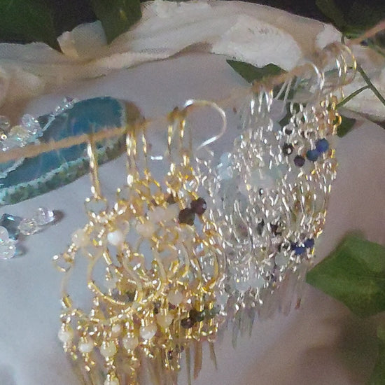 These exquisite chandelier earrings are a cascade of crystal energy and elegance. Each pair features a unique combination of crystals, meticulously hand-wrapped in your choice of gold or silver-plated copper wire. The stones hang at varying lengths, creating a graceful, flowing silhouette that beautifully catches the light. Perfect for adding a touch of sophisticated sparkle and intention to any outfit, these earrings are a true statement piece.