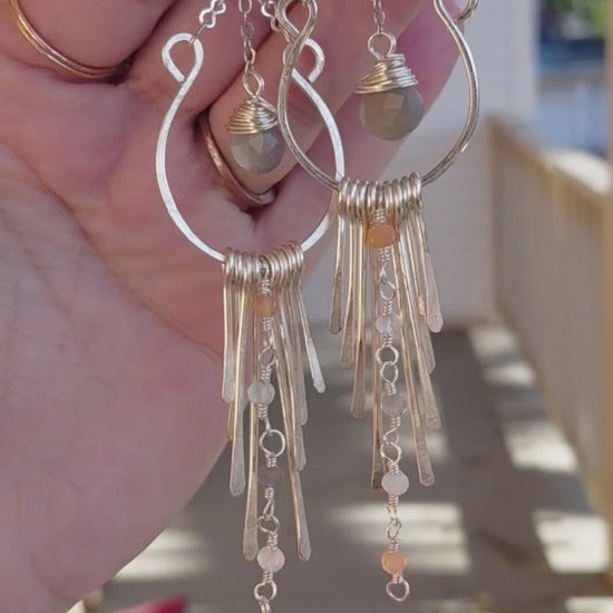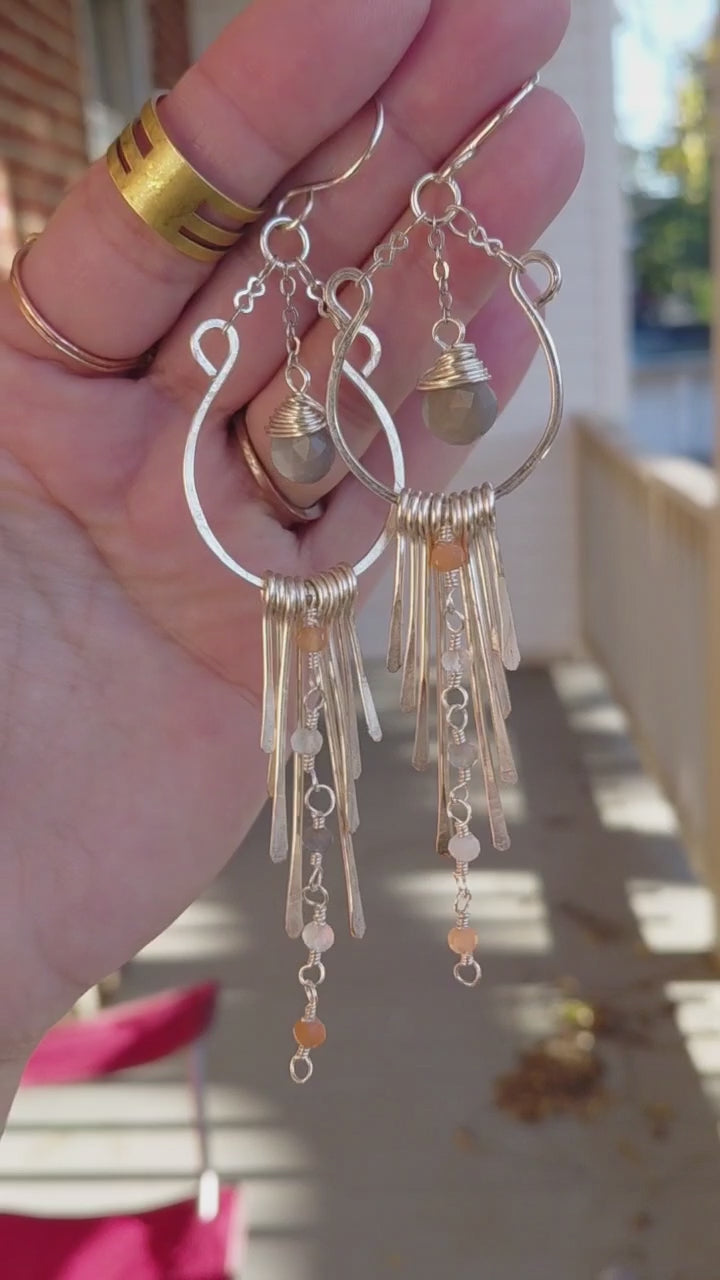 These stunning handcrafted chandelier earrings are designed to be a gentle, flowing presence in a world that often feels fast and chaotic. Made from your choice of gold-plated or silver-plated copper wire, they feature a beautiful semi-hoop base from which a waterfall of hammered pieces descends.