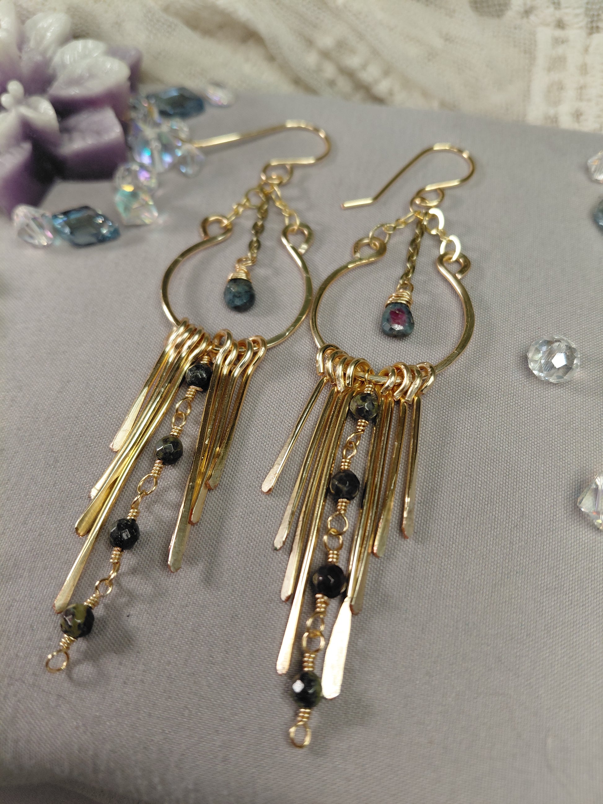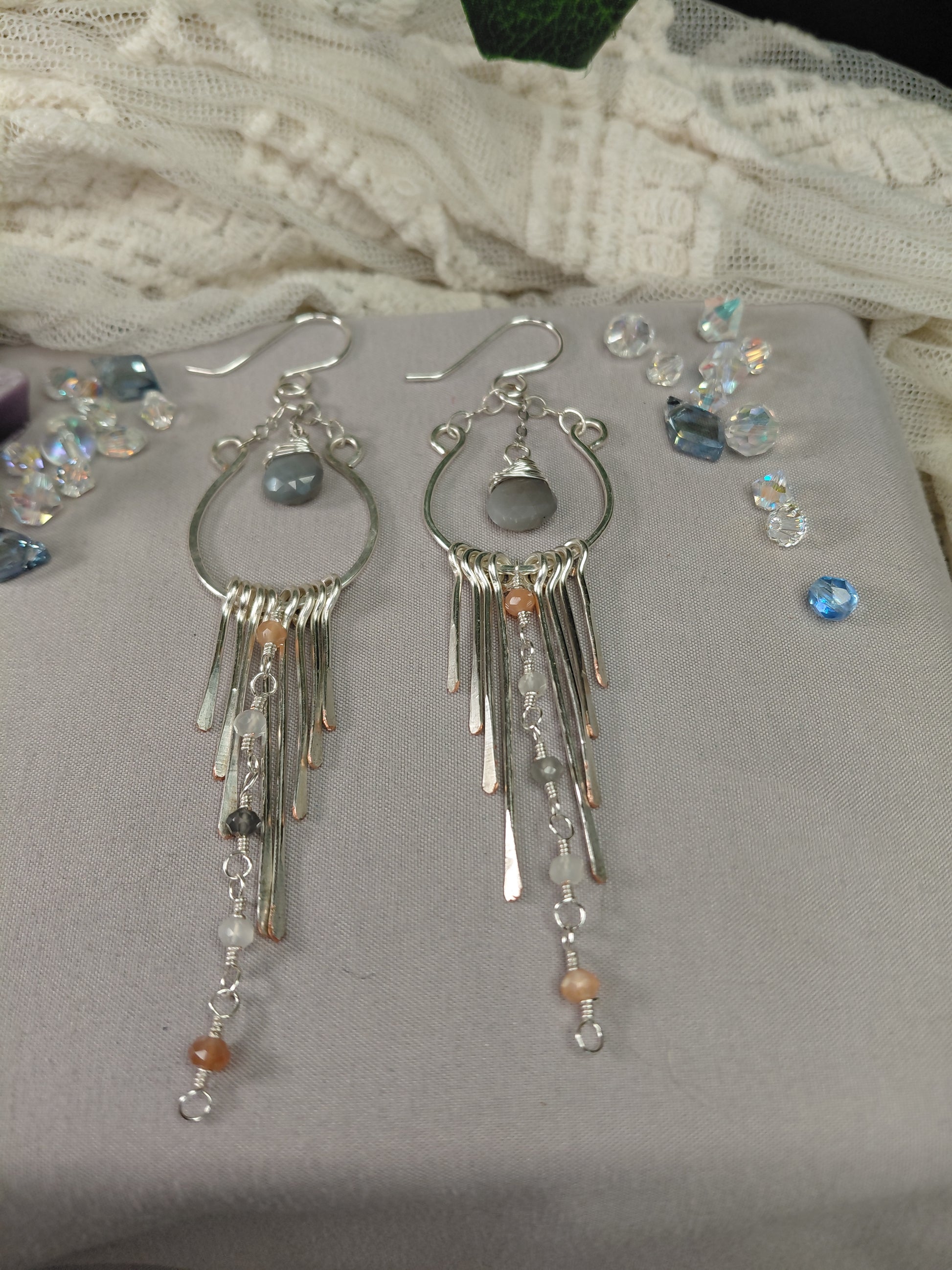 The dynamic movement and staggered lengths create a mesmerizing "waterflow" effect—a visual reminder that grace and recovery are found one drop, one moment, at a time. Dangling from the ear wire and descending through the hoop is a small semi-precious faceted gemstone briolette which is the focal point of these stunning earrings.💎